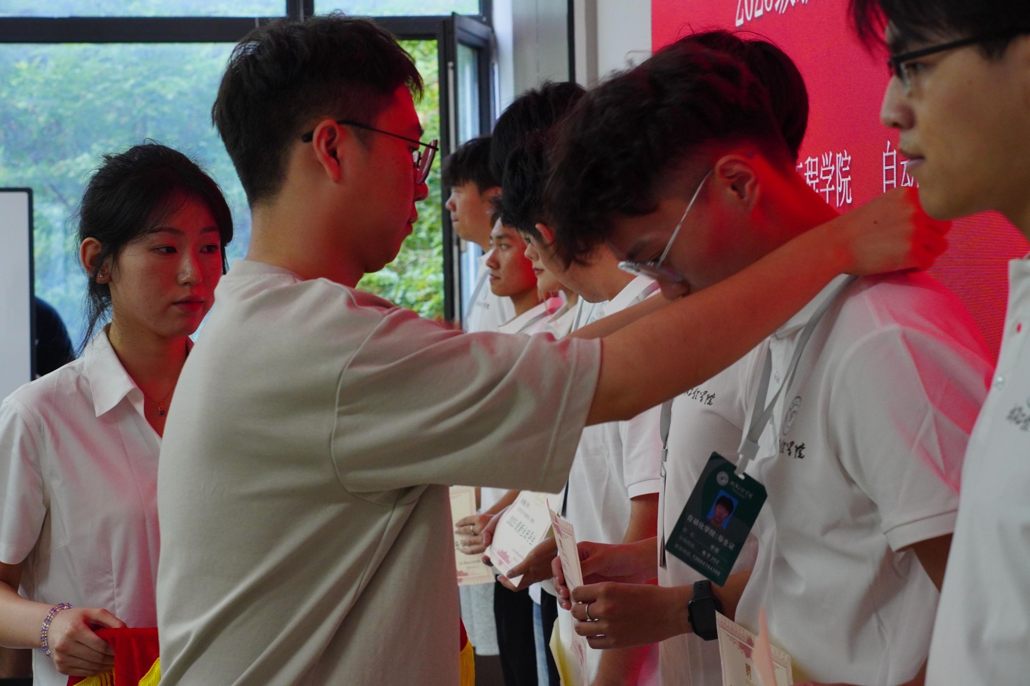 会议在热烈的掌声中开始,现场庄严又温暖。新生班辅导员杨乘一老师率先发言,他用充满激情的话语承诺,将全力以赴做好万全准备,确保新生享受贴心、顺畅的入学体验。其后,导生代表、学生会主席团成员贾子健宣读了2025级班导生名单。随后举行的聘任仪式上,新生班辅导员老师为导生们颁发了聘书和专属服装,象征着这支骨干队伍正式亮相,肩负起新身份赋予的责任。
