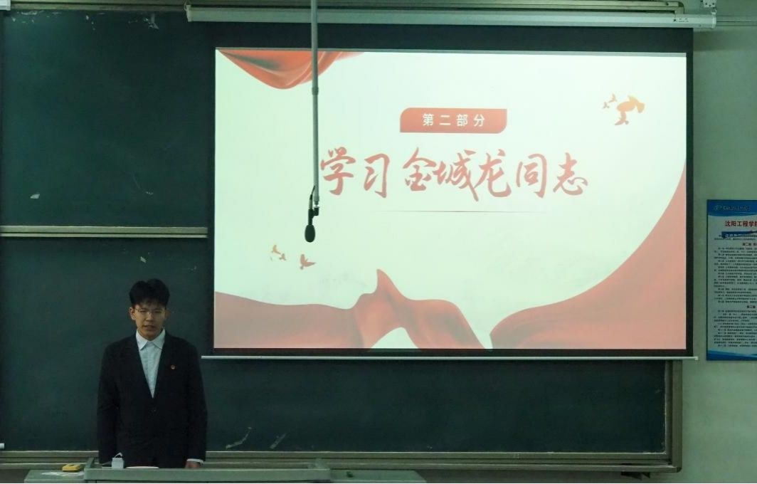 活动中,学生代表魏广超组织全体团干部深入学习金城龙同志先进事迹。他围绕 “向金城龙学什么”“如何将个人成长融入强国建设” 等核心议题,通过事迹讲述、互动分享及专题视频观看,带领大家走进金城龙的成长故事,感受其对理想的执着追求与对社会的深切关怀,学习他坚守初心、恪尽职守、舍己为人、无私奉献的高尚品格,领悟榜样精神的时代价值与实践意义。